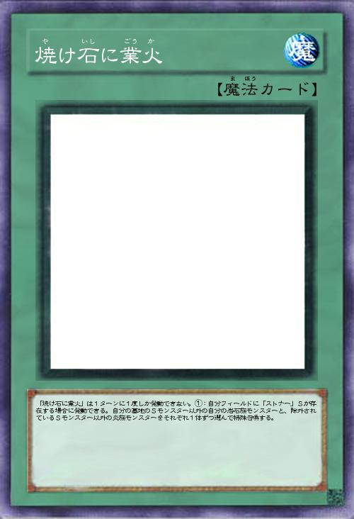 | 「焼け石に業火」は1ターンに1度しか発動できない。①:自分フィールドに「ストナー」Sが存在する場合に発動できる。自分の墓地のSモンスター以外の自分の岩石族モンスターと、除外されているSモンスター以外の炎族モンスターをそれぞれ1体ずつ選んで特殊召喚する。 | |||