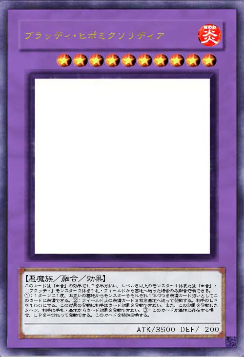 | このカードは「血合」の効果でLPを半分払い、レベル8以上のモンスター1体または「血合」・「ブラッディ」モンスター2体を手札・フィールドから墓地へ送った場合のみ融合召喚できる。 ①:1ターンに1度、お互いの墓地からモンスターをそれぞれ1体づつを装備カード扱いとしてこのカードに装備できる。②:フィールド上の装備カード3枚を墓地へ送って発動する。相手のLPを100にする。この効果の発動に相手はカード効果を発動できない。また、この効果を発動したターン、相手は手札・墓地からカード効果を発動できない。③:このカードが墓地に存在する場 合、LPを半分払って発動できる。このカードを特殊召喚する。 | |||
