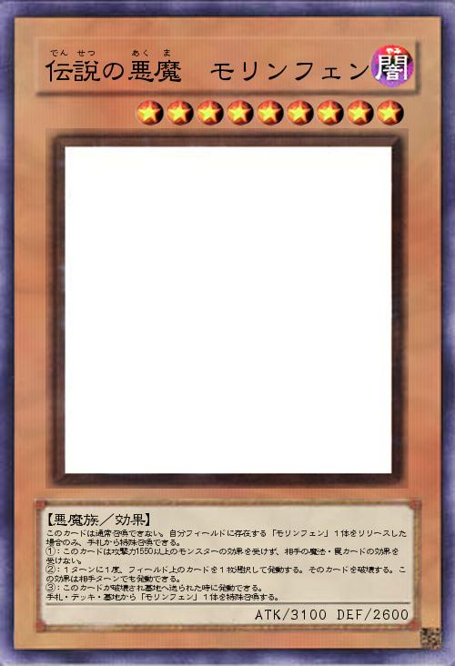 | このカードは通常召喚できない。自分フィールドに存在する「モリンフェン」1体をリリースした場合のみ、手札から特殊召喚できる。 ①:このカードは攻撃力1550以上のモンスターの効果を受けず、相手の魔法・罠カードの効果を受けない。 ②:1ターンに1度、フィールド上のカードを1枚選択して発動する。そのカードを破壊する。この効果は相手ターンでも発動できる。 ③:このカードが破壊され墓地へ送られた時に発動できる。 手札・デッキ・墓地から「モリンフェン」1体を特殊召喚する。 | |||