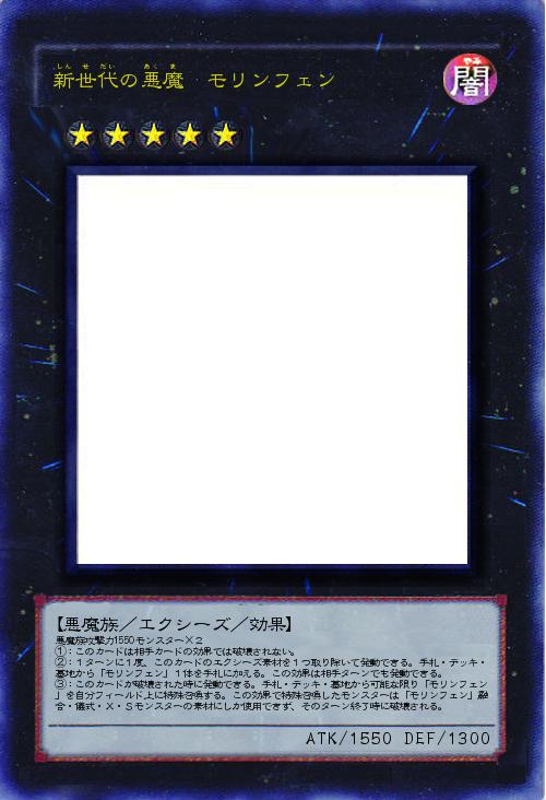 | 悪魔族攻撃力1550モンスター×2 ①:このカードは相手カードの効果では破壊されない。 ②:1ターンに1度、このカードのエクシーズ素材を1つ取り除いて発動できる。手札・デッキ・墓地から「モリンフェン」1体を手札に加える。この効果は相手ターンでも発動できる。 ③:このカードが破壊された時に発動できる。手札・デッキ・墓地から可能な限り「モリンフェン」を自分フィールド上に特殊召喚する。この効果で特殊召喚したモンスターは「モリンフェン」融合・儀式・X・Sモンスターの素材にしか使用できず、そのターン終了時に破壊される。 | |||