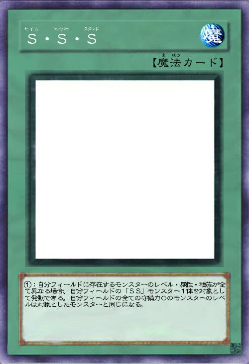 | ①:自分フィールドに存在するモンスターのレベル・属性・種族が全て異なる場合、自分フィールドの「SS」モンスター1体を対象として発動できる。自分フィールドの全ての守備力0のモンスターのレベルは対象としたモンスターと同じになる。 | |||