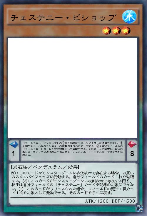 | 「チェステニー・ビショップ」の②のP効果は1ターンに1度しか使用できない。①:相手フィールドのモンスターの攻撃力は300アップする。②:自分フィールドの「チェステニー」カード1枚を対象として発動できる。そのカードを破壊し、自分のエクストラデッキに表側表示で存在する「チェステニー」Pモンスター1体を手札に加える。 | |||