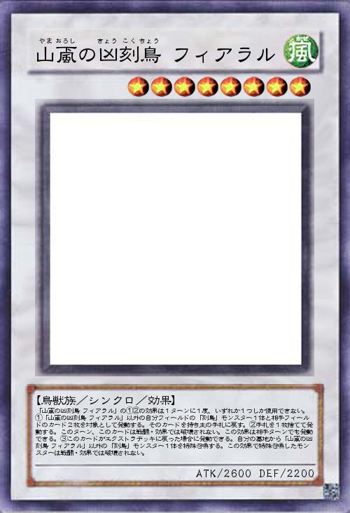 | 「山颪の凶刻鳥 フィアラル」の①②の効果は1ターンに1度、いずれか1つしか使用できない。①「山颪の凶刻鳥 フィアラル」以外の自分フィールドの「刻鳥」モンスター1体と相手フィールドのカード2枚を対象として発動する。そのカードを持ち主の手札に戻す。②手札を1枚捨てて発動する。このターン、このカードは戦闘・効果では破壊されない。この効果は相手ターンでも発動できる。③このカードがエクストラデッキに戻った場合に発動できる。自分の墓地から「山颪の凶刻鳥 フィアラル」以外の「刻鳥」モンスター1体を特殊召喚する。この効果で特殊召喚したモンスターは戦闘・効果では破壊されない。 | |||