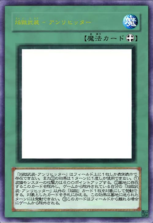 | 「焔獄武装-アンリヒッター」はフィールド上に1枚しか表側表示で存在できない。また②の効果は1ターンに1度しか使用できない。①装備モンスターの攻撃力は600ポイントアップする。②墓地に存在するこのカードを除外し、ゲームから除外されている自分の「焔獄武装-アンリヒッター」以外の「焔獄」カード1枚を対象にして発動できる。対象としたカードを手札に加える。この効果は墓地に送られたターンには発動できない。③このカードはフィールドから離れる場合にゲームから除外される。 | |||