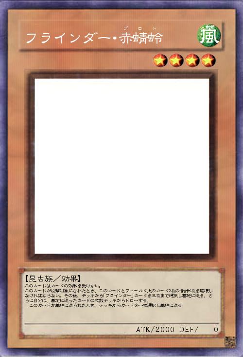 | このカードはカードの効果を受けない。 このカードが攻撃対象にされたとき、このカードとフィールド上のカード2枚の合計3枚を破壊しなければならない。その後、デッキから「フラインダー」カードを三枚まで選択し墓地に送る、さらに自分は、墓地に送ったカードの枚数デッキからドローする。 このカードが墓地に送られたとき、デッキからカードを一枚選択し墓地に送る | |||