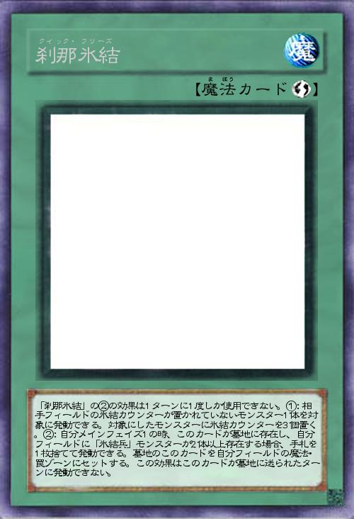 | 「刹那氷結」の②の効果は1ターンに1度しか使用できない。①:相手フィールドの氷結カウンターが置かれていないモンスター1体を対象に発動できる。対象にしたモンスターに氷結カウンターを3個置く。②:自分メインフェイズ1の時、このカードが墓地に存在し、自分フィールドに「氷結兵」モンスターが2体以上存在する場合、手札を1枚捨てて発動できる。墓地のこのカードを自分フィールドの魔法・罠ゾーンにセットする。この効果はこのカードが墓地に送られたターンに発動できない。 | |||