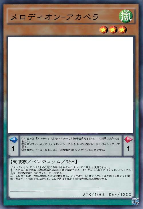 | 「メロディオン-アカペラ」の①②の効果はそれぞれ1ターンに1度しか使用できない。 ①:このカードが召喚・特殊召喚に成功した時に発動できる。自分フィールド上の「メロディオン」モンスターの攻撃力は100ポイントアップする。 ②:このカードがP召喚に成功した時に発動できる。デッキから「メロディオン」または「メロディ」魔法・罠カード1枚を手札に加える。この効果は手札からのP召喚時にのみ発動できる。 | |||