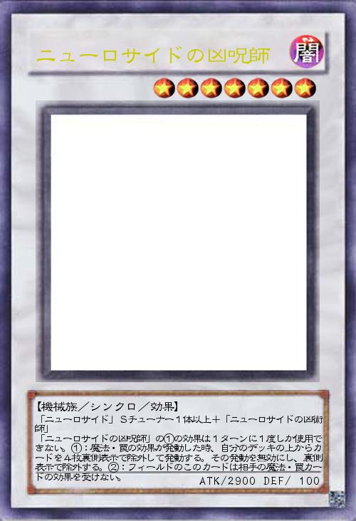 | 「ニューロサイド」Sチューナー1体以上+「ニューロサイドの凶術師」 「ニューロサイドの凶呪師」の①の効果は1ターンに1度しか使用できない。①:魔法・罠の効果が発動した時、自分のデッキの上からカードを4枚裏側表示で除外して発動する。その発動を無効にし、裏側表示で除外する。②:フィールドのこのカードは相手の魔法・罠カードの効果を受けない。 | |||