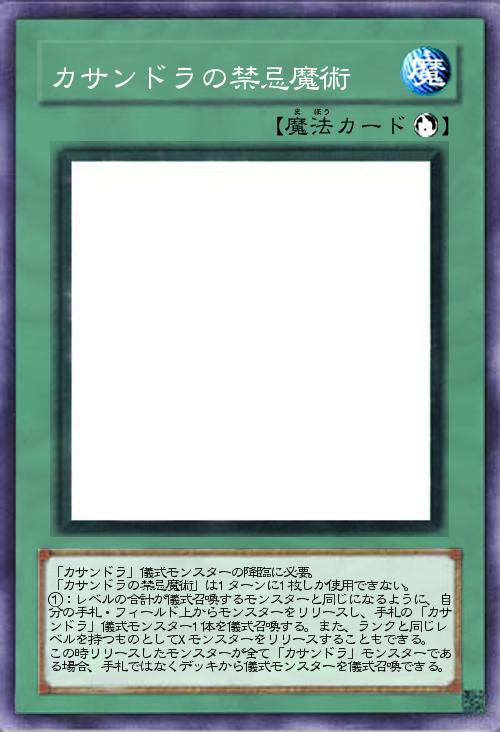 | 「カサンドラ」儀式モンスターの降臨に必要。 「カサンドラの禁忌魔術」は1ターンに1枚しか使用できない。 ①:レベルの合計が儀式召喚するモンスターと同じになるように、自分の手札・フィールド上からモンスターをリリースし、手札の「カサンドラ」儀式モンスター1体を儀式召喚する。また、ランクと同じレベルを持つものとしてXモンスターをリリースすることもできる。 この時リリースしたモンスターが全て「カサンドラ」モンスターである場合、手札ではなくデッキから儀式モンスターを儀式召喚できる。 | |||