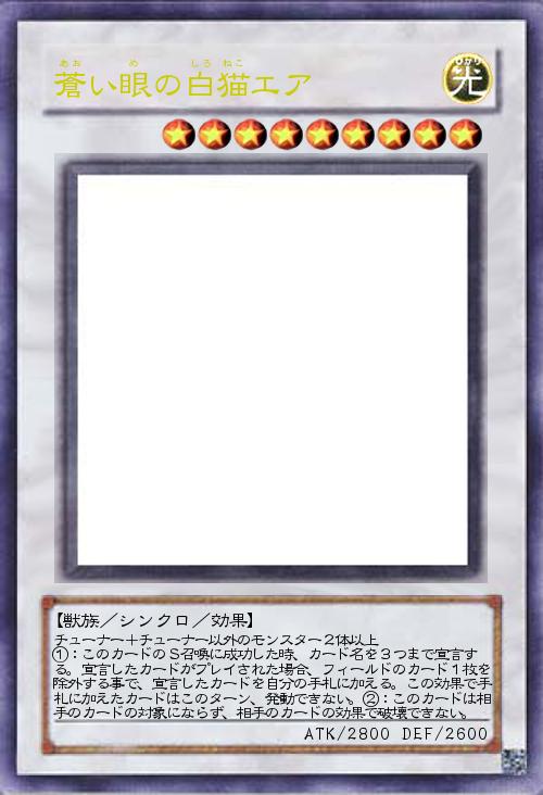「猫たちのシンクロモンスター。カードを3枚宣言し、宣言したカードがプレイさせると除外を「コスト」にそのカードを自分の手札に加える。コストにできるカードは相手フィールドでもよかったり、宣言したカードを相手が使えばそれを自分の手札に加えられるというもの。プレイヤーの腕が試される、面白いカードだと思います。②の効果でブラックホールとかに巻き込まれずに宣言しておけば手に入る、でも自分の効果ではやられます。」(2015-10-02 18:43)