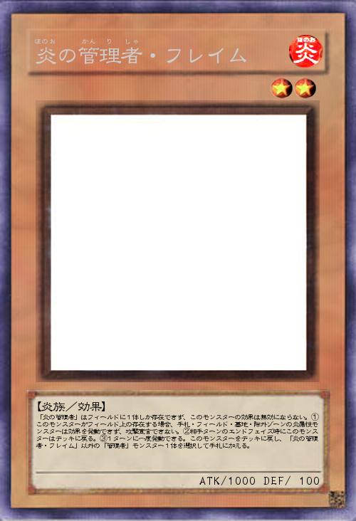 | 「炎の管理者」はフィールドに1体しか存在できず、このモンスターの効果は無効にならない。①このモンスターがフィールド上の存在する場合、手札・フィールド・墓地・除外ゾーンの炎属性モンスターは効果を発動できず、攻撃宣言できない。②相手ターンのエンドフェイズ時にこのモンスターはデッキに戻る。③1ターンに一度発動できる。このモンスターをデッキに戻し、「炎の管理者・フレイム」以外の「管理者」モンスター1体を選択して手札に加える。 | |||