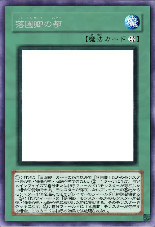 | ①:自分は「落園卿」カードの効果以外で「落園卿」以外のモンスターを召喚・特殊召喚・反転召喚できない。②:1ターンに1度、自分メインフェイズに自分または相手フィールドにモンスターが存在しない場合に発動できる。モンスターが存在しないプレイヤーの墓地からモンスター1体を選んでそのプレイヤーのフィールドに特殊召喚する。③:自分フィールドに「落園卿」モンスター以外のモンスターが召喚・特殊召喚・反転召喚に成功した時に発動する。そのモンスターをデッキに戻す。④:自分フィールドに「落園卿」モンスターが存在する場合、このカードは相手の効果では破壊されない。 | |||