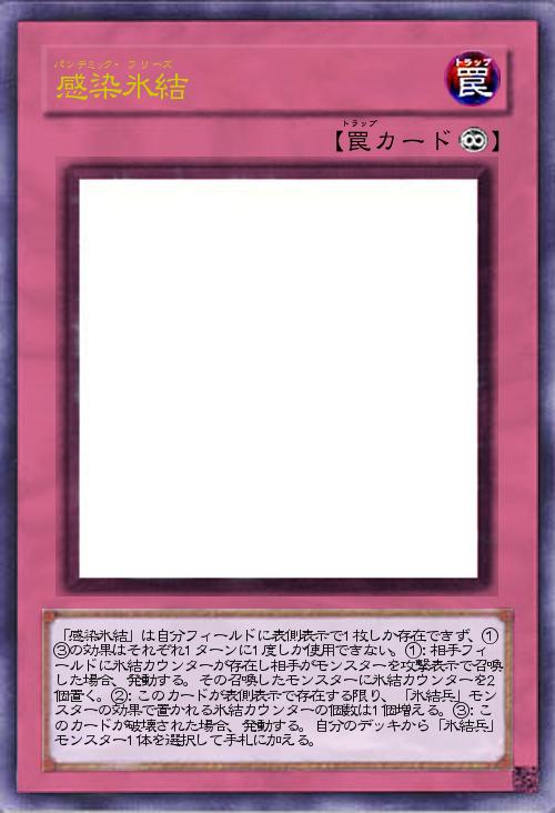 | 「感染氷結」は自分フィールドに表側表示で1枚しか存在できず、①③の効果はそれぞれ1ターンに1度しか使用できない。①:相手フィールドに氷結カウンターが存在し相手がモンスターを攻撃表示で召喚した場合、発動する。その召喚したモンスターに氷結カウンターを2個置く。②:このカードが表側表示で存在する限り、「氷結兵」モンスターの効果で置かれる氷結カウンターの個数は1個増える。③:このカードが破壊された場合、発動する。自分のデッキから「氷結兵」モンスター1体を選択して手札に加える。 | |||