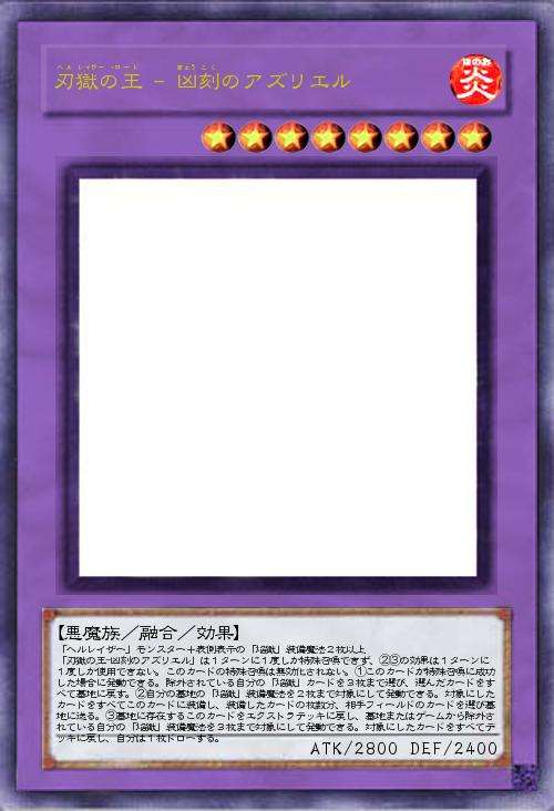 | 「ヘルレイザー」モンスター+表側表示の「焔獄」装備魔法2枚以上 「刃獄の王-凶刻のアズリエル」は1ターンに1度しか特殊召喚できず、②③の効果は1ターンに1度しか使用できない。このカードの特殊召喚は無効化されない。①このカードが特殊召喚に成功した場合に発動できる。除外されている自分の「焔獄」カードを3枚まで選び、選んだカードをすべて墓地に戻す。②自分の墓地の「焔獄」装備魔法を2枚まで対象にして発動できる。対象にしたカードをすべてこのカードに装備し、装備したカードの枚数分、相手フィールドのカードを選び墓地に送る。③墓地に存在するこのカードをエクストラデッキに戻し、墓地またはゲームから除外されている自分の「焔獄」装備魔法を3枚まで対象にして発動できる。対象にしたカードをすべてデッキに戻し、自分は1枚ドローする。 | |||
