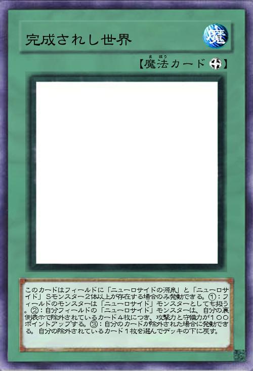 | このカードはフィールドに「ニューロサイドの源泉」と「ニューロサイド」Sモンスター2体以上が存在する場合のみ発動できる。①:フィールドのモンスターは「ニューロサイド」モンスターとしても扱う。②:自分フィールドの「ニューロサイド」モンスターは、自分の裏側表示で除外されているカード4枚につき、攻撃力と守備力が100ポイントアップする。③:自分のカードが除外された場合に発動できる。自分の除外されているカード1枚を選んでデッキの下に戻す。 | |||