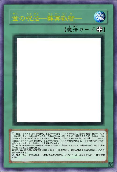| ①:自分フィールド上に『呪法師』と名のついたモンスターが存在し、自分の魔法・罠ゾーンのカードが自分フィールド上のモンスターの数より少ない時、手札を一枚捨てることで、このカードはデッキからフィールド上にセットできる。 『呪法』と名のついたカードのこの効果は、1ターンに自分フィールド上の『呪法師』と名のついたモンスターの数だけ使える。 この効果でデッキからセットしたターン、このカードを発動できない。 ②:自分の墓地のレベル4魔法使い族モンスターと「呪法」と名のついた魔法カード1枚づつをデッキの下に戻して発動できる。 自分または相手の墓地の魔法使い族モンスター1体を選択し、表側攻撃表示で特殊召喚し、このカードを装備する。 ③:魔法・罠ゾーンのこのカードが墓地に送られた時、自分フィールド上のモンスター一体を破壊する。 | |||