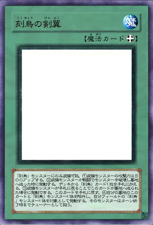 「刻鳥カテゴリ19枚目。気がついたら20枚台に突入しそうですね。そんな19枚目のカードは専用装備魔法。①は打点強化。上昇値も500と低くありません。②は装備モンスターが戦闘破壊した時に発動するサーチ効果。サーチ対象は「刻鳥」カードなので範囲は広く強力です。この効果は①とシナジーがありますね。③は「u.aパワーギブス」と同じで刻鳥をバウンスした時に自身を回収することができます。ただし④の効果とは相性悪いですね。④は刻鳥をチューナーに変えるというだけのアドバンテージを得る効果ではありませんがこの効果によってシンクロ召喚がしやすくなるのではないかと思います。なのであえて③の効果を使わないという選択肢もありますね。②の効果にターン数制限つけなかったのは仕様です。戦闘を介してサーチするので「今の」環境なら条件は厳しい方と判断しました。とはいえ万能サーチに加えてシンクロサポートなので強いカードかなと思ってます。ちなみにこのカードの名前である剣翼ですが、見ればわかる通り造語です。イラストイメージとして刻鳥の翼につけるもので、装備した翼で切り裂く、なんて妄想です笑