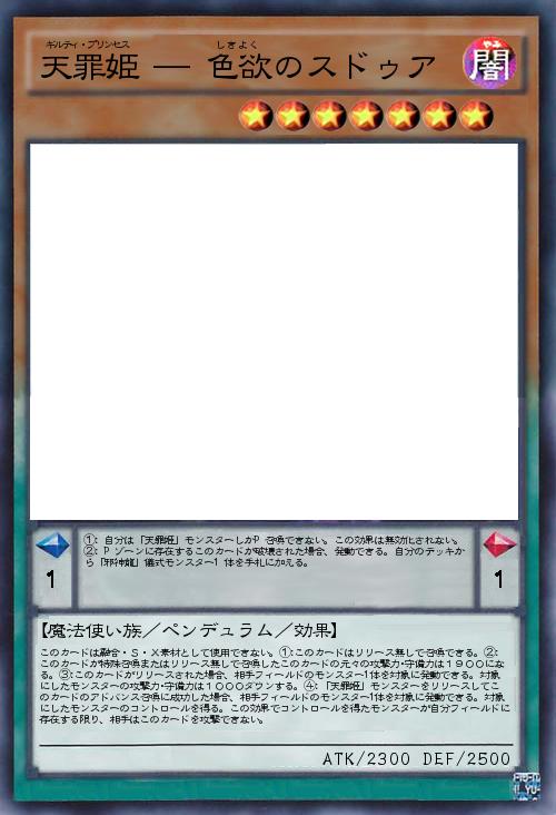 | このカードは融合・S・X素材として使用できない。①:このカードはリリース無しで召喚できる。②:このカードが特殊召喚またはリリース無しで召喚したこのカードの元々の攻撃力・守備力は1900になる。③:このカードがリリースされた場合、相手フィールドのモンスター1体を対象に発動できる。対象にしたモンスターの攻撃力・守備力は1000ダウンする。④:「天罪姫」モンスターをリリースしてこのカードのアドバンス召喚に成功した場合、相手フィールドのモンスター1体を対象に発動できる。対象にしたモンスターのコントロールを得る。この効果でコントロールを得たモンスターが自分フィールドに存在する限り、相手はこのカードを攻撃できない。 | |||