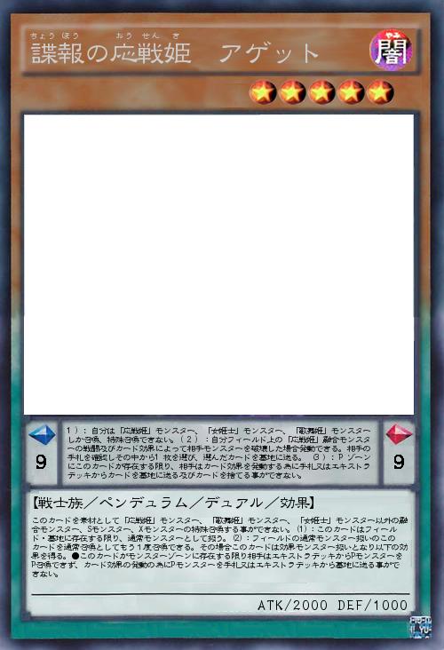 | このカードを素材として「応戦姫」モンスター、「歌舞姫」モンスター、「女姫士」モンスター以外の融合モンスター、Sモンスター、Xモンスターの特殊召喚する事ができない。(1):このカードはフィールド・墓地に存在する限り、通常モンスターとして扱う。(2):フィールドの通常モンスター扱いのこのカードを通常召喚としてもう1度召喚できる。その場合このカードは効果モンスター扱いとなり以下の効果を得る。●このカードがモンスターゾーンに存在する限り相手はエキストラデッキからPモンスターをP召喚できず、カード効果の発動の為にPモンスターを手札又はエキストラデッキから墓地に送る事ができない。 | |||