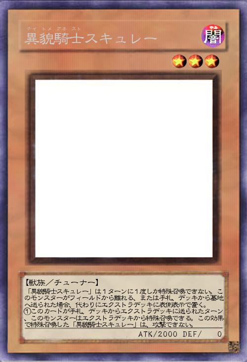 | 「異貌騎士スキュレー」は1ターンに1度しか特殊召喚できない。このモンスターがフィールドから離れる、または手札、デッキから墓地へ送られた場合、代わりにエクストラデッキに表側表示で置く。 ①このカードが手札、デッキからエクストラデッキに送られたターン、このモンスターはエクストラデッキから特殊召喚できる。この効果で特殊召喚した「異貌騎士スキュレー」は、攻撃できない。 | |||