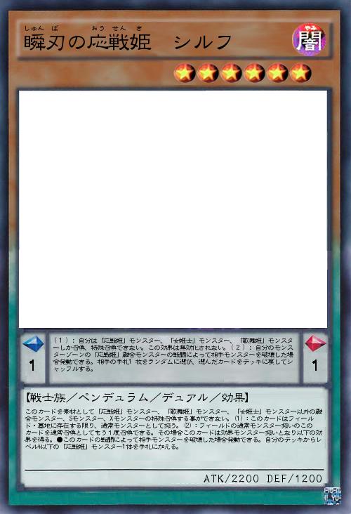| このカードを素材として「応戦姫」モンスター、「歌舞姫」モンスター、「女姫士」モンスター以外の融合モンスター、Sモンスター、Xモンスターの特殊召喚する事ができない。(1):このカードはフィールド・墓地に存在する限り、通常モンスターとして扱う。(2):フィールドの通常モンスター扱いのこのカードを通常召喚としてもう1度召喚できる。その場合このカードは効果モンスター扱いとなり以下の効果を得る。●このカードの戦闘によって相手モンスターを破壊した場合発動できる。自分のデッキからレベル4以下の「応戦姫」モンスター1体を手札に加える。 | |||