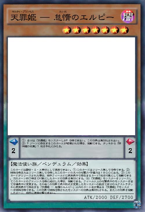 | このカードは融合・S・X素材として使用できない。①:このカードはリリース無しで召喚できる。②:特殊召喚またはリリース無しで召喚したこのカードの元々の攻撃力・守備力は1900になる。③:このカードがリリースされた場合、相手フィールドに表側表示で存在するカード1枚を対象にして発動できる。次のターン終了時まで対象にしたカードの効果を無効にする。④:「天罪姫」モンスターをリリースしてこのカードのアドバンス召喚に成功した場合、発動できる。フィールド上の攻撃表示のモンスターを全て守備表示に変更する。その後この効果で表示形式を変更したモンスターの数まで自分のエクストラデッキに表側表示で存在する「天罪姫 ― 怠惰のエルピー」以外のカード名が異なる「天罪姫」Pモンスターを特殊召喚できる。この効果で特殊召喚されたモンスターの効果は無効化される。またこの効果を発動したターン、相手に直接攻撃できない。 | |||