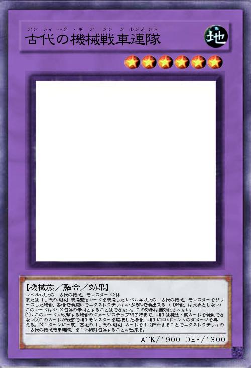 | レベル4以上の「古代の機械」モンスター×2体 または「古代の機械」装備魔法カードを装備したレベル4以上の「古代の機械」モンスターをリリースした場合、融合召喚扱いでエクストラデッキから特殊召喚出来る(「融合」は必要としない) このカードはS・X召喚の素材とすることはできない。この効果は無効化されない。 ①:このカードが攻撃する場合のダメージステップ終了時まで、相手は魔法・罠カードを発動できない②このカードが戦闘で相手モンスターを破壊した場合、相手に600ポイントのダメージを与える。③1ターンに一度、墓地の「古代の機械」カードを1枚除外することでエクストラデッキの「古代の機械戦車連隊」を1体特殊召喚することが出来る。 | |||