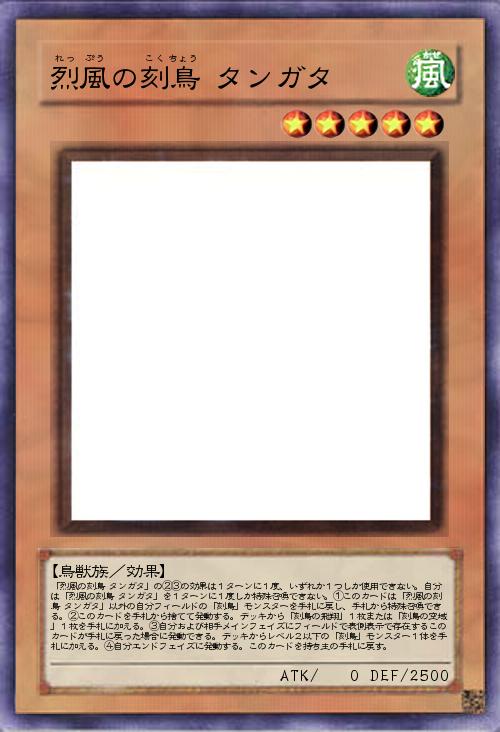 | 「烈風の刻鳥 タンガタ」の②③の効果は1ターンに1度、いずれか1つしか使用できない。自分は「烈風の刻鳥 タンガタ」を1ターンに1度しか特殊召喚できない。①このカードは「烈風の刻鳥 タンガタ」以外の自分フィールドの「刻鳥」モンスターを手札に戻し、手札から特殊召喚できる。②このカードを手札から捨てて発動する。デッキから「刻鳥の飛翔」1枚または「刻鳥の空域」1枚を手札に加える。③自分および相手メインフェイズにフィールドで表側表示で存在するこのカードが手札に戻った場合に発動できる。デッキからレベル2以下の「刻鳥」モンスター1体を手札に加える。④自分エンドフェイズに発動する。このカードを持ち主の手札に戻す。 | |||