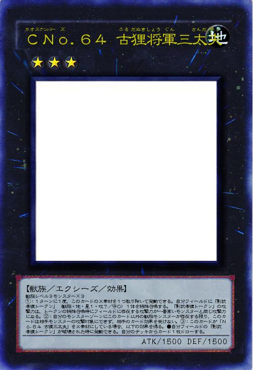| 獣族レベル3モンスター×3 ①:1ターンに1度、このカードのX素材を1つ取り除いて発動できる。自分フィールドに「影武者狸トークン」(獣族・地・星1・攻?/守0)1体を特殊召喚する。「影武者狸トークン」の攻撃力は、トークンの特殊召喚時にフィールドに存在する攻撃力が一番高いモンスターと同じ攻撃力になる。②:自分のモンスターゾーンにこのカード以外の獣族モンスターが存在する限り、このカードは相手モンスターの攻撃対象にできず、相手のカード効果を受けない。③:このカードが「No.64 古狸三太夫」をX素材にしている場合、以下の効果を得る。●自分フィールドの「影武者狸トークン」が破壊された時に発動できる。自分のデッキからカード1枚ドローする。 | |||