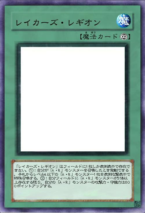 | 「レイカーズ・レギオン」はフィールドに1枚しか表側表示で存在できない。①:自分が「A・R」モンスターを召喚したとき発動できる。手札からレベル4以下の「A・R」モンスター1枚を表側攻撃表示で特殊召喚する。②:自分フィールドに「A・R」モンスターが3体以上存在する限り、自分の「A・R」モンスターの攻撃力・守備力は600ポイントアップする。 | |||