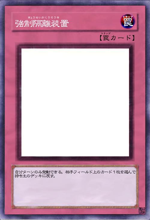 | 自分ターンのみ発動できる。相手フィールド上のカード1枚を選んで持ち主のデッキに戻す。 | |||