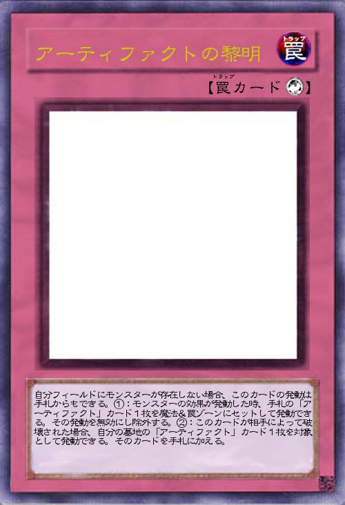 | 自分フィールドにモンスターが存在しない場合、このカードの発動は手札からもできる。①:モンスターの効果が発動した時、手札の「アーティファクト」カード1枚を魔法&罠ゾーンにセットして発動できる。その発動を無効にし除外する。②:このカードが相手によって破壊された場合、自分の墓地の「アーティファクト」カード1枚を対象として発動できる。そのカードを手札に加える。 | |||