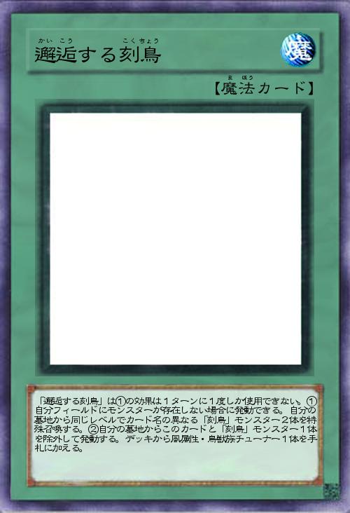 | 「邂逅する刻鳥」は①の効果は1ターンに1度しか使用できない。①自分フィールドにモンスターが存在しない場合に発動できる。自分の墓地から同じレベルでカード名の異なる「刻鳥」モンスター2体を特殊召喚する。②自分の墓地からこのカードと「刻鳥」モンスター1体を除外して発動する。デッキから風属性・鳥獣族チューナー1体を手札に加える。 | |||