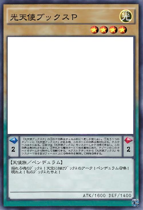 | 「光天使ブックスP」の③のP効果はデュエル中に1度しか使えない。①もう1つのPゾーンに「光天使ブックスP」がある時、このカードの効果は無効化され、Pスケールは6になる。②自分は「光天使ブックス」モンスターしかP召喚できない。この効果は無効化されない。③手札から魔法カード1枚を墓地に送り、Pゾーンのこのカードをゲームから除外して発動できる。エクストラデッキから「光天使ブックス」モンスター1体を自分フィールド上に召喚条件を無視して特殊召喚する。 | |||