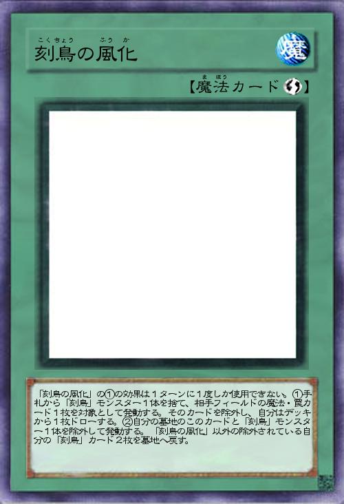 「刻鳥カテゴリ23枚目。キリが良いので25枚で刻鳥は終わらせようと考えてます。さて今回は「デュアルスパーク」を若干意識して作りました。デッキ圧縮、魔法罠除去、墓地肥やしの3つをこなせるカードですね。割と使いやすいカードなのではないかと思ってます。名前の「風化」ですが本来の意味なら岩が長い間かけて変化するという意味ですが、今回の「風化」は刻鳥モンスターが「風に化ける」という意味で風化という名前を付けました。」(2015-10-17 16:19)