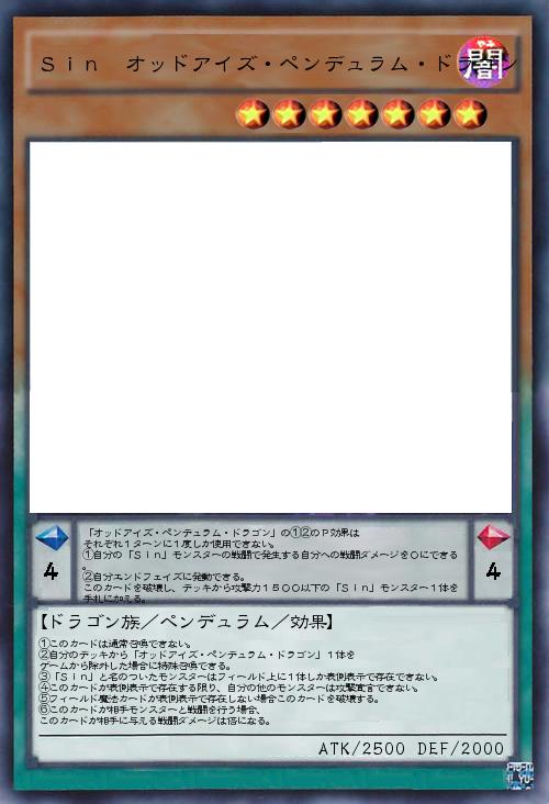 | ①このカードは通常召喚できない。 ②自分のデッキから「オッドアイズ・ペンデュラム・ドラゴン」1体を ゲームから除外した場合に特殊召喚できる。 ③「Sin」と名のついたモンスターはフィールド上に1体しか表側表示で存在できない。 ④このカードが表側表示で存在する限り、自分の他のモンスターは攻撃宣言できない。 ⑤フィールド魔法カードが表側表示で存在しない場合このカードを破壊する。 ⑥このカードが相手モンスターと戦闘を行う場合、 このカードが相手に与える戦闘ダメージは倍になる。 | |||