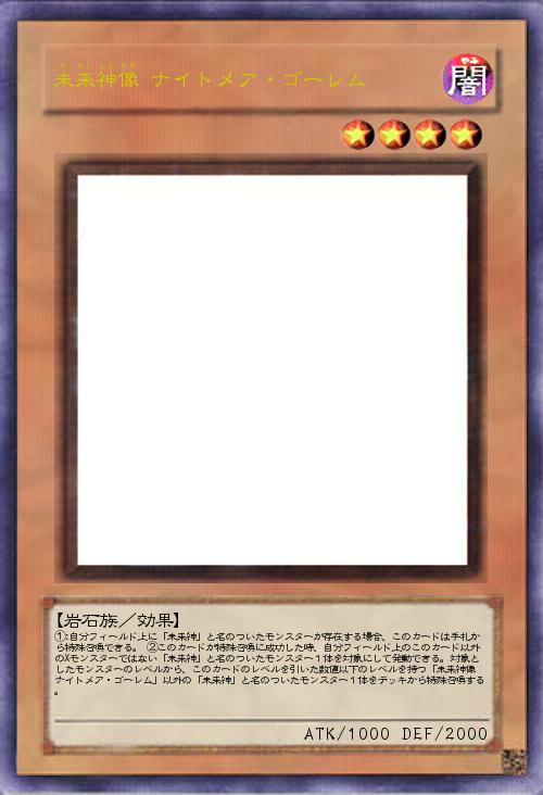 | ①:自分フィールド上に「未来神」と名のついたモンスターが存在する場合、このカードは手札から特殊召喚できる。 ②このカードが特殊召喚に成功した時、自分フィールド上のこのカード以外のXモンスターではない「未来神」と名のついたモンスター1体を対象にして発動できる。対象としたモンスターのレベルから、このカードのレベルを引いた数値以下のレベルを持つ「未来神像 ナイトメア・ゴーレム」以外の「未来神」と名のついたモンスター1体をデッキから特殊召喚する。 | |||