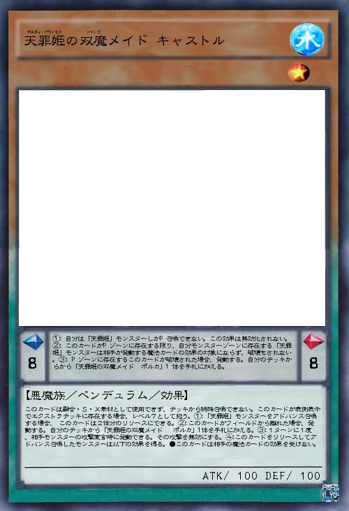 | このカードは融合・S・X素材として使用できず、デッキから特殊召喚できない。このカードが表側表示でエクストラデッキに存在する場合、レベル7として扱う。①:「天罪姫」モンスターをアドバンス召喚する場合、 このカードは2体分のリリースにできる。②:このカードがフィールドから離れた場合、発動する。自分のデッキから「天罪姫の双魔メイド ポルカ」1体を手札に加える。③:1ターンに1度、相手モンスターの攻撃宣言時に発動できる。その攻撃を無効にする。④:このカードをリリースしてアドバンス召喚したモンスターは以下の効果を得る。●このカードは相手の魔法カードの効果を受けない。 | |||