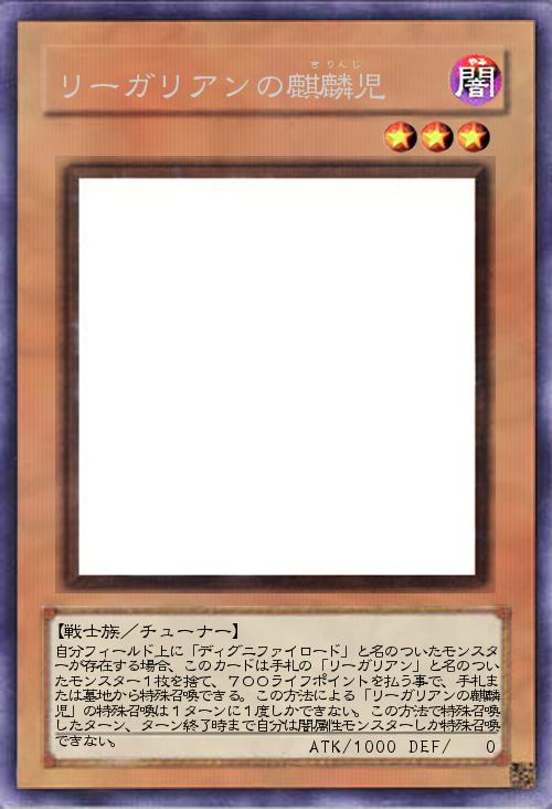 | 自分フィールド上に「ディグニファイロード」と名のついたモンスターが存在する場合、このカードは手札の「リーガリアン」と名のついたモンスター1枚を捨て、700ライフポイントを払う事で、手札または墓地から特殊召喚できる。この方法による「リーガリアンの麒麟児」の特殊召喚は1ターンに1度しかできない。この方法で特殊召喚したターン、ターン終了時まで自分は闇属性モンスターしか特殊召喚できない。 | |||