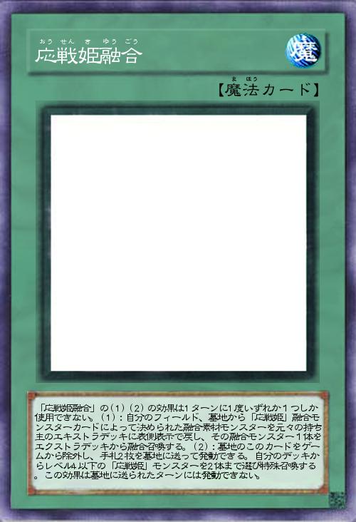 | 「応戦姫融合」の(1)(2)の効果は1ターンに1度いずれか1つしか使用できない。(1):自分のフィールド、墓地から「応戦姫」融合モンスターカードによって決められた融合素材モンスターを元々の持ち主のエキストラデッキに表側表示で戻し、その融合モンスター1体をエクストラデッキから融合召喚する。(2):墓地のこのカードをゲームから除外し、手札2枚を墓地に送って発動できる。自分のデッキからレベル4以下の「応戦姫」モンスターを2体まで選び特殊召喚する。この効果は墓地に送られたターンには発動できない。 | |||