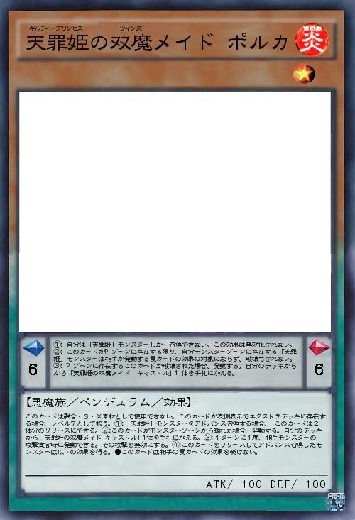 | このカードは融合・S・X素材として使用できない。このカードが表側表示でエクストラデッキに存在する場合、レベル7として扱う。①:「天罪姫」モンスターをアドバンス召喚する場合、 このカードは2体分のリリースにできる。②:このカードがモンスターゾーンから離れた場合、発動する。自分のデッキから「天罪姫の双魔メイド キャストル」1体を手札に加える。③:1ターンに1度、相手モンスターの攻撃宣言時に発動できる。その攻撃を無効にする。④:このカードをリリースしてアドバンス召喚したモンスターは以下の効果を得る。●このカードは相手の罠カードの効果を受けない。 | |||