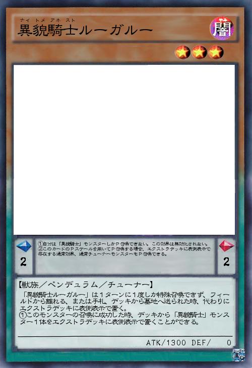 | ①自分は「異貌騎士」モンスターしかP召喚できない。この効果は無効化されない。②このカードのPスケールを用いてP召喚する場合、エクストラデッキに表側表示で存在する通常効果、通常チューナーモンスターもP召喚できる。 | |||