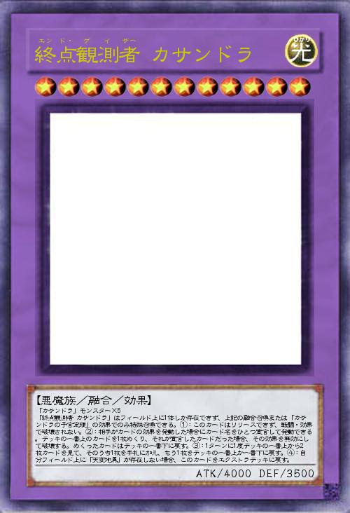 | 「カサンドラ」モンスター×5 「終点観測者 カサンドラ」はフィールド上に1体しか存在できず、上記の融合召喚または「カサンドラの予言定理」の効果でのみ特殊召喚できる。①:このカードはリリースできず、戦闘・効果で破壊されない。②:相手がカードの効果を発動した場合にカード名をひとつ宣言して発動できる。デッキの一番上のカードを1枚めくり、それが宣言したカードだった場合、その効果を無効にして破壊する。めくったカードはデッキの一番下に戻す。③:1ターンに1度デッキの一番上から2枚カードを見て、そのうち1枚を手札に加え、もう1枚をデッキの一番上か一番下に戻す。④:自分フィールド上に「天変地異」が存在しない場合、このカードをエクストラデッキに戻す。 | |||