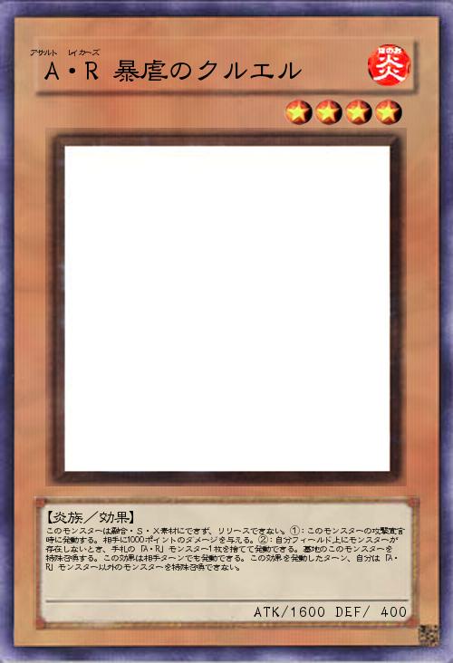 | このモンスターは融合・S・X素材にできず、リリースできない。①:このモンスターの攻撃宣言時に発動する。相手に1000ポイントのダメージを与える。②:自分フィールド上にモンスターが存在しないとき、手札の「A・R」モンスター1枚を捨てて発動できる。墓地のこのモンスターを特殊召喚する。この効果は相手ターンでも発動できる。この効果を発動したターン、自分は「A・R」モンスター以外のモンスターを特殊召喚できない。 | |||