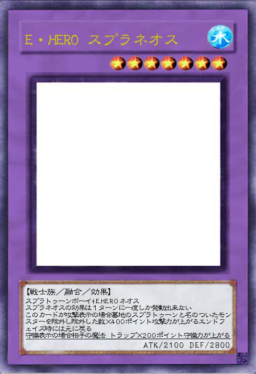 | スプラトゥーンボーイ+EHEROネオス スプラネオスの効果は1ターンに一度しか発動出来ない このカードが攻撃表示の場合墓地のスプラトゥーンと名のついたモンスターを除外し除外した数×400ポイント攻撃力が上がるエンドフェイズ時には元に戻る 守備表示の場合相手の魔法 トラップ×200ポイント守備力が上がる | |||