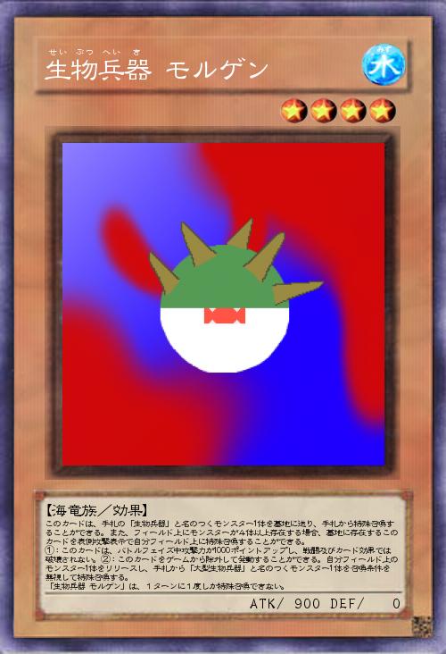 | このカードは、手札の「生物兵器」と名のつくモンスター1体を墓地に送り、手札から特殊召喚することができる。また、フィールド上にモンスターが4体以上存在する場合、墓地に存在するこのカードを表側攻撃表示で自分フィールド上に特殊召喚することができる。 ①:このカードは、バトルフェイズ中攻撃力が1000ポイントアップし、戦闘及びカード効果では破壊されない。②:このカードをゲームから除外して発動することができる。自分フィールド上のモンスター1体をリリースし、手札から「大型生物兵器」と名のつくモンスター1体を召喚条件を無視して特殊召喚する。 「生物兵器 モルゲン」は、1ターンに1度しか特殊召喚できない。 | |||