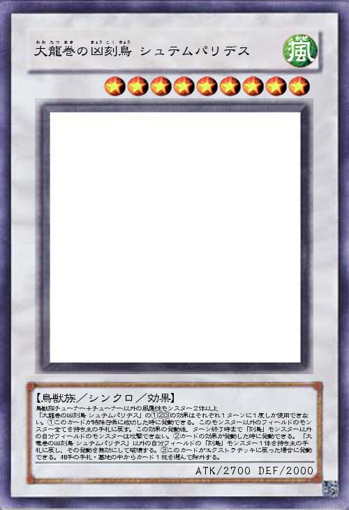 「刻鳥エラッタ第1号。効果がちゃんと記載されなかったので書き直すついでに効果も変えました。①の効果をそのままですが②の効果は「霞の谷の巨神鳥」のような効果になりました。元の効果は手札コストで相手モンスターを永久奪取でしたがやっぱり強すぎたかなと思い効果を変えました。自分フィールドに「刻鳥」モンスターがいるときに出せば①の効果をほぼ確実に通せますね。巨神鳥と違って自身をコストには出来ないことに注意です。ただ巨神鳥と同じで刻鳥シンクロモンスターをエクストラデッキに戻しても無効効果を発動できます。③の効果は元はシュテムパリデス以外の刻鳥シンクロモンスターを特殊召喚するものでしたがそれも変えました。シンクロはとりあえずこいつだしとけば後続でシンクロ出せるからわざわざ678シンクロ出さなくていいやってことになるのがやっぱり嫌だったので。①の効果で相手の手札も増えることがあるので③で削るという意味合いでもこういう効果になりました。というわけで刻鳥エラッタ第1号でした。」(2015-10-21 14:33)