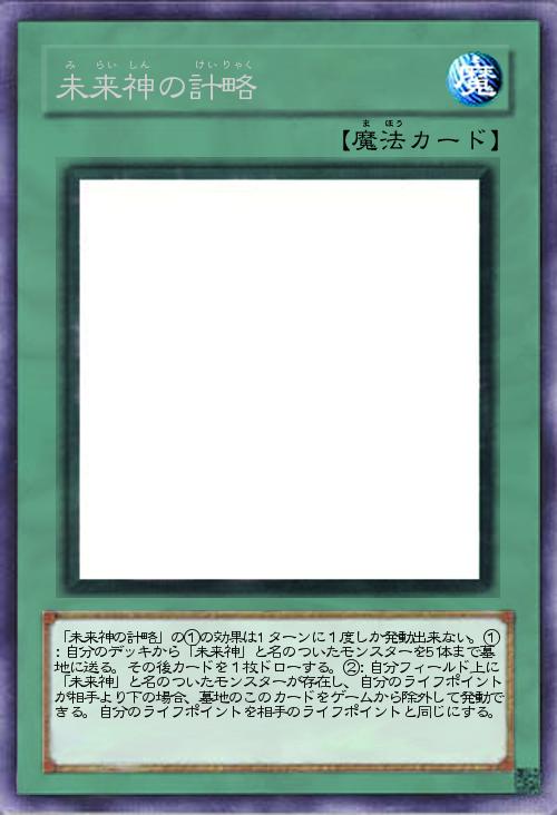 | 「未来神の計略」は1ターンに1度しか発動出来ない。①:自分のデッキから「未来神」と名のついたモンスターを5体まで墓地に送る。その後カードを1枚ドローする。②:自分フィールド上に「未来神」と名のついたモンスターが存在し、自分のライフポイントが相手より下の場合、墓地のこのカードをゲームから除外して発動できる。自分のライフポイントを相手のライフポイントと同じにする。 | |||