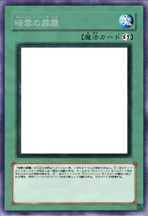 | 「暗雲の霹靂」の①②の効果は1ターンに1度、いずれか1つしか使用できない。①:自分フィールドにモンスターが存在しない場合に発動できる。デッキから「ヴァンベット」モンスター1体を手札に加えるか特殊召喚する。②: 自分フィールドの「ヴァンベット」モンスターが墓地へ送られた場合、相手フィールドのカード1枚を対象として発動できる。そのカードを破壊する。 | |||