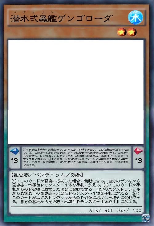 現状P召喚が可能なのはこのカードとアメンボートと魔酔虫の3種類、魔酔虫に関してはバニラになってしまいます。P特化カテゴリになりそうな潜水式蟲艦、これからどんなカードが増えていくのか楽しみです。」(2015-10-23 22:02)
